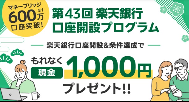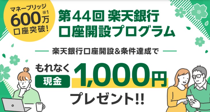 楽天銀行開設+マネーブリッジ登録+条件達成でもれなく現金最大1000円をプレゼント